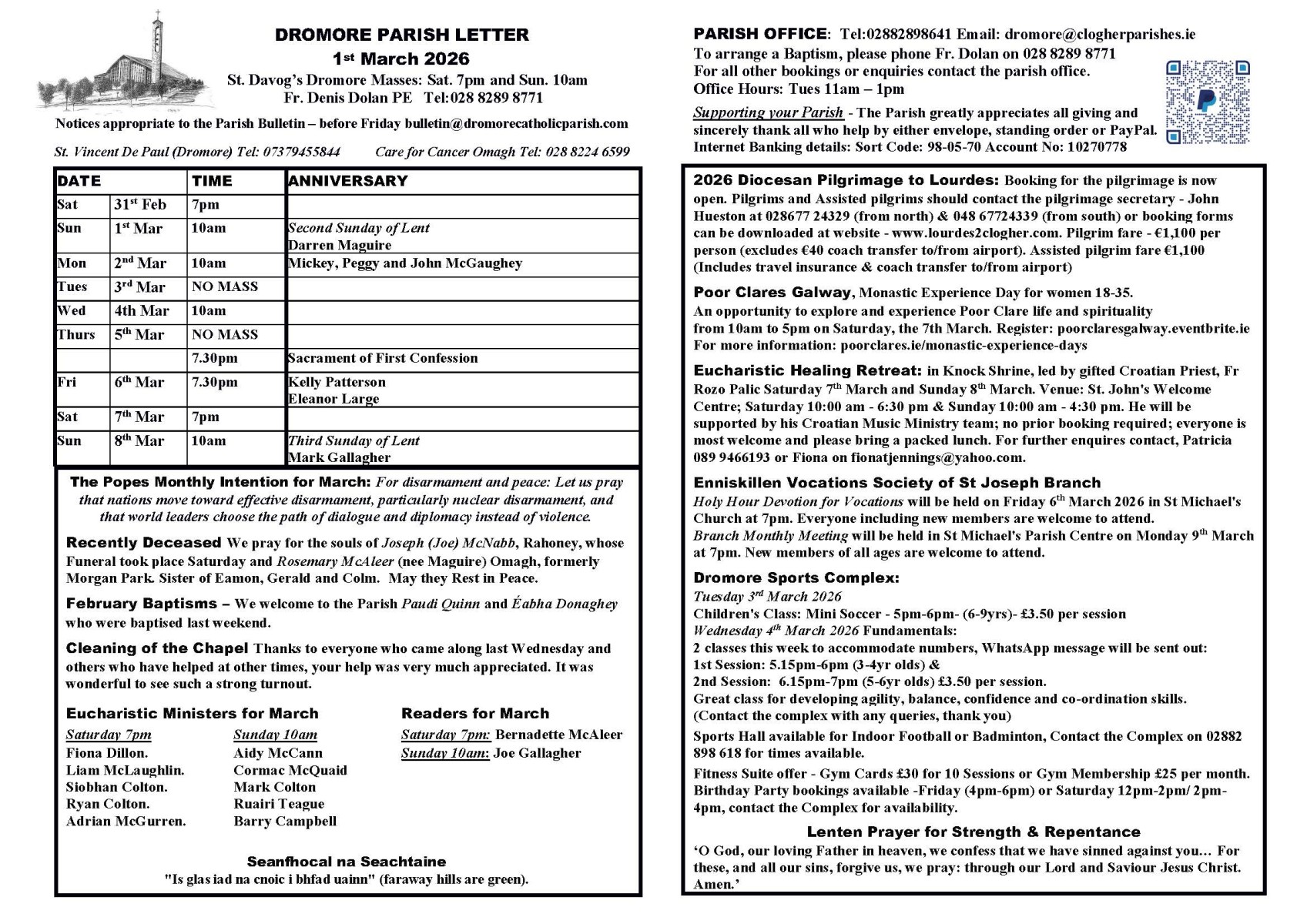 Tel:02882898641 or Email: dromore@clogherparishes.ie To arrange a Baptism, please phone Fr. Dolan on 028 8289 8771. For all other bookings or enquiries contact the parish office. Office Hours: Tuesday 11am – 1pm