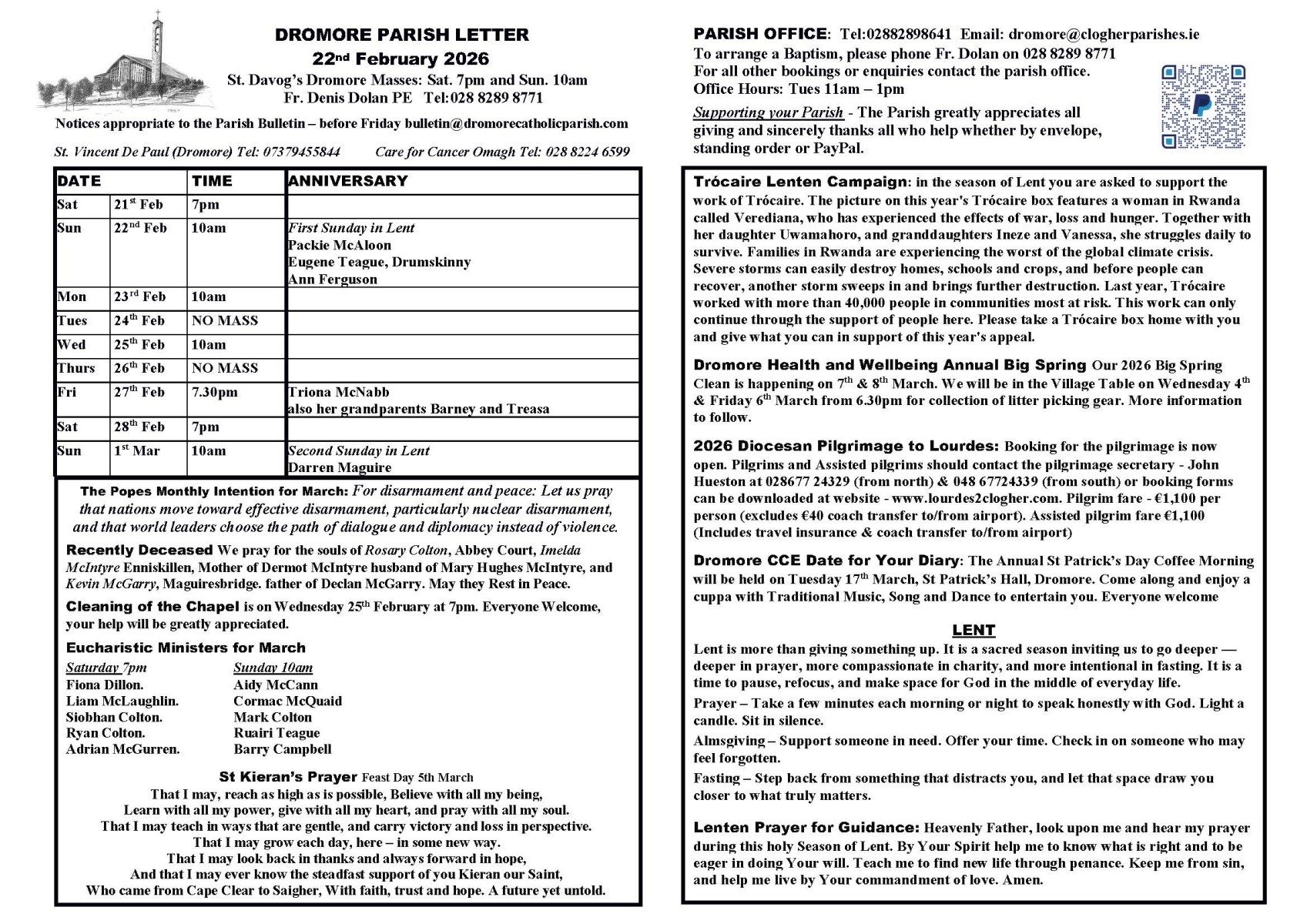 Date for Your Diary: The Annual St Patrick’s Day Coffee Morning will be held on Tuesday 17th March, St Patrick’s Hall, Dromore. Come along and enjoy a cuppa with Traditional Music, Song and Dance to entertain you. Everyone welcome.
