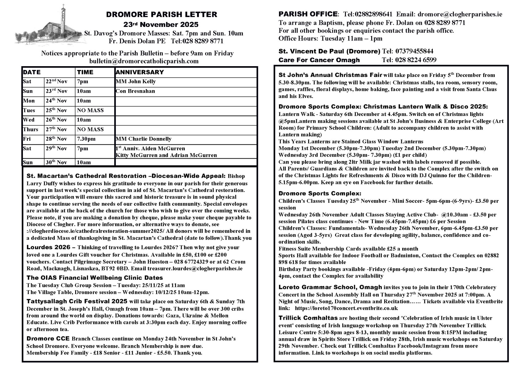 St. Macartan’s Cathedral Restoration –Diocesan-Wide Appeal: Bishop Larry Duffy wishes to express his gratitude to everyone in our parish for their generous support in last week’s special collection in aid of St. Macartan’s Cathedral restoration. Your participation will ensure this sacred and historic treasure is in sound physical shape to continue serving the needs of our collective faith community. Special envelopes are available at the back of the church for those who wish to give over the coming weeks. Please note, if you are making a donation by cheque, please make your cheque payable to Diocese of Clogher. For more information, or alternative ways to donate, see http ://clogherdiocese.ie/cathedralrestoration-summer2025/ All donors will be remembered in a dedicated Mass of thanksgiving in St. Macartan’s Cathedral (date to follow).Thank you