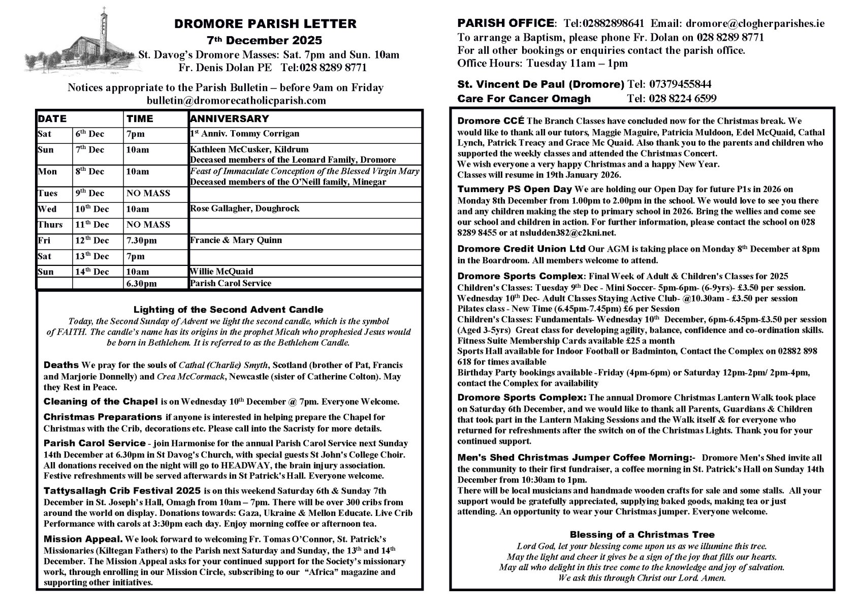 Annual Bereavement Mass for all our dead took place Thursday 14th November at 7.30pm. These are the names of those from the Parish who have died since our last faithful departed Mass in November 2023. Tony Canavan, Mary Quinn , Seamus Bonner, Susan Hannigan, Joseph McGlone ,Bob Harper, Eleanor Large, Jean Leonard, Tommy McManus, Paddy Hughes, Jimmy Mc Gale, Seamus McGlone (Snr), Christy McCaffrey, Tommy Hunter, Eamon Slevin, Joe Campbell, Maureen Garrity, Rosemary Quinn, Mary Molloy, Michael Gallagher, Peter Scott, Jean O’Neill, Ann Connolly Seamus McGlone(Jnr), Myra Hunter, Michael Mc Canny, Seamus Corey, Phyllis Winters, Francis McGirr, Tommy McQuaid, Sally McNulty, Gerald O’Neill.